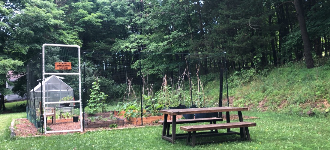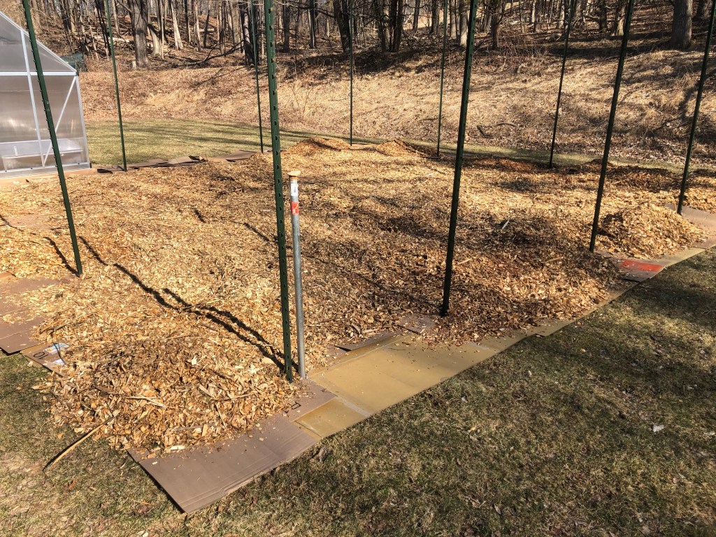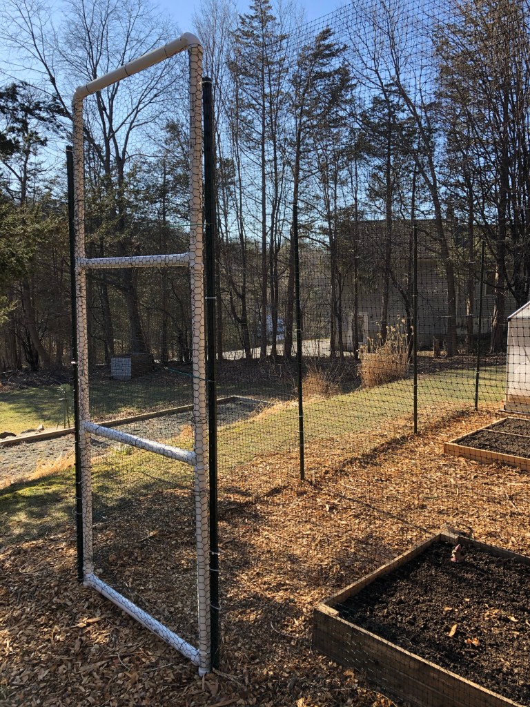 Lastly, I built a gate/door out of PVC pipe by connecting the pipes together with straight joints and 90-degree joints where needed. I then lined the gate with chicken wire. The gate opens and closes, as it pivots on a steel 5-foot rod. A couple climbing carabiners hold the gate shut. I may improve upon this system in the future, as it feels a bit improvised, yet not inconvenient.