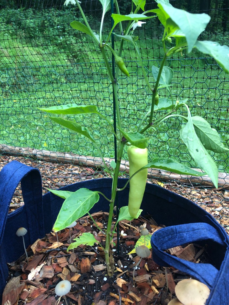 The 10-gallon and 20-gallon grow bags were reserved for 3 types of tomatoes (Cherry, Homestead, and Brandywine), all of which are indeterminate types (meaning they’ll keep growing and setting fruit until the frost kills them). The tomatoes got a late start due to a very cold May, but they did alight once they got going. Banana peppers lived in some of the other grow bags and they did quite well. Only 1 Bell pepper made it to maturity and is slowly making its way.
