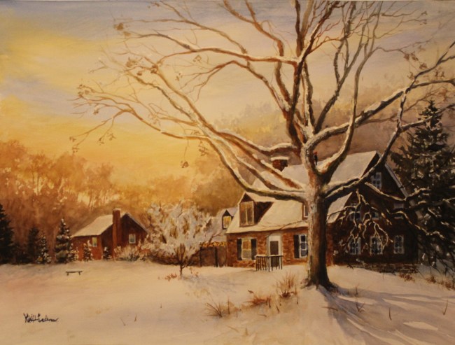 I am thankful for a few good recent snow storms in my neighborhood, which inspired this painting. The house on the right seems to be a “second home”; the light is never on, and there is hardly any sign of life other than an occasional pileated woodpecker in that big old oak tree. On one night in July this year, this place was rockin with about 40 strong, and that was the only time I have ever seen a human soul here. I could be totally off the mark of course, as this might be the residence of Count Dracula. No, perhaps it’s Xavier’s School for Gifted Youngsters. Oh, I guess I’ll never know.