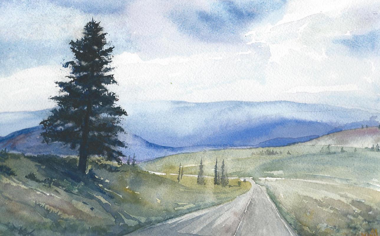 A quick silhouette style painting! On the road late in the day, the light fades, causing the objects nearest to the viewer look very dark, which then allows for a dramatic silhouette effect. Watercolor paint always dries lighter so I found myself going back several times to darken the foreground. Then, you naturally look toward the lighter areas in the painting. Finally, I added cable wires for more perspective.