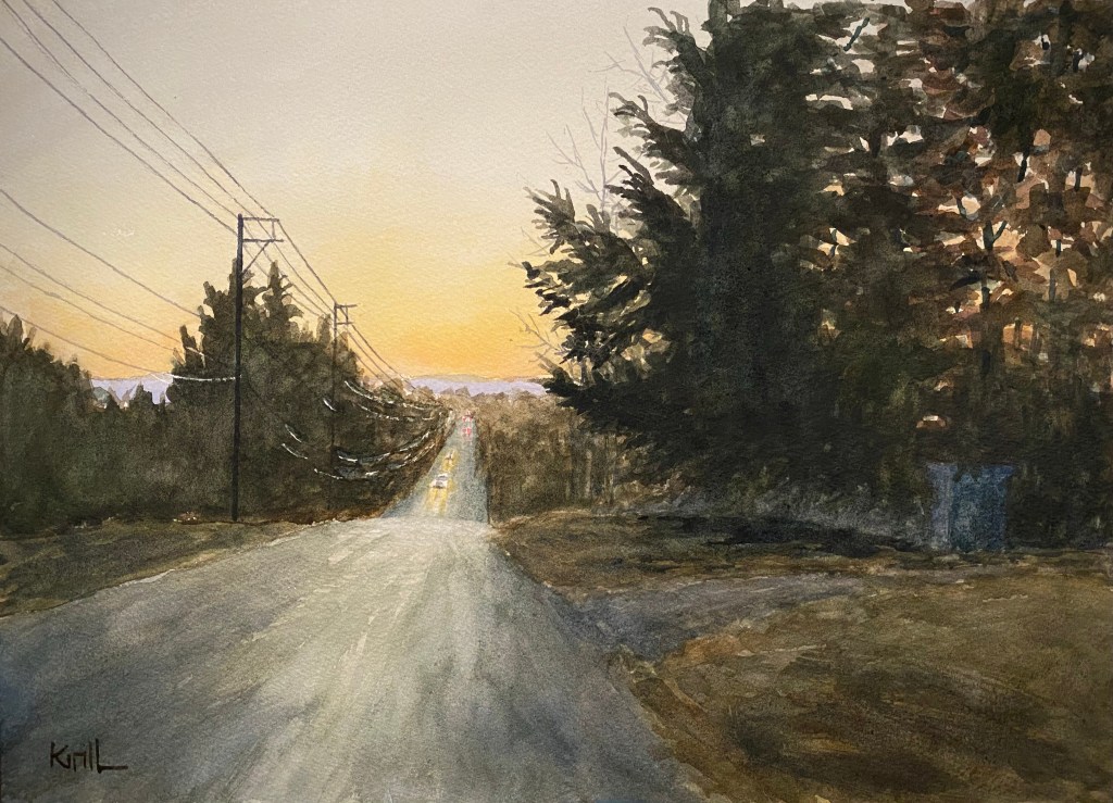 I haven’t given up on the salt watercolor technique tutorials yet, although I probably should, since the first salt video that I put on social media was a bit of a flop (so far). But, I’ve got high hopes for this one because it did turn out to be a solid winter landscape painting! The idea of the painting hit me as I was driving the kids to school. The sky at sunrise was beautiful but subtle, as the sun remained hidden behind thick winter clouds, but there was just enough luminosity to have something special to enjoy on our ride to school. On my way back home, I snapped a quick photo on the side of the road and thought; the sky would look even more interesting with a salt effect if were to paint this scene in watercolor.